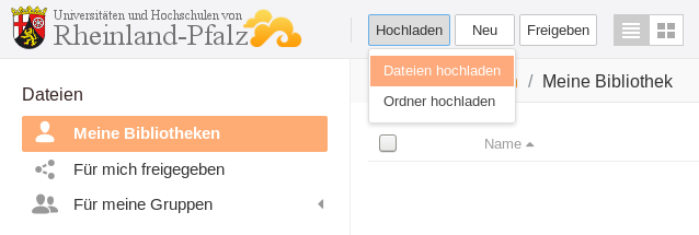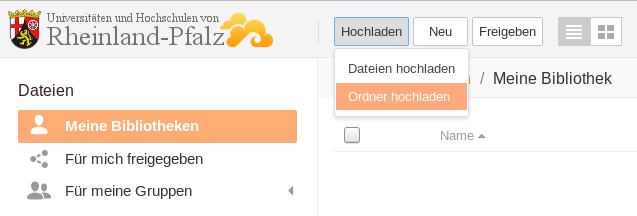To upload a whole folder in Seafile, first open a library. Then click on the Upload button at the top of the window and select Upload Folder. The file manager of your operating system opens, where you can select the desired folder. After selecting the folder, a window with the upload progress will appear in the bottom right corner. After the folder and the included files have been uploaded, you can open them.