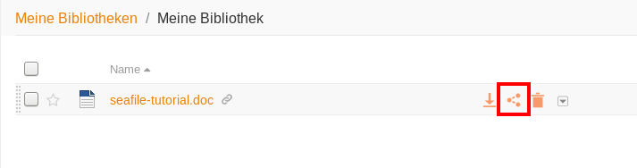 To share files, move the mouse over the line of the corresponding file. After that three icons appear in the line. Click on the second icon. This will open a small window. Click on the Generate button and a Download-Link will be displayed. Which you can share with other people. For more information, see Share files.