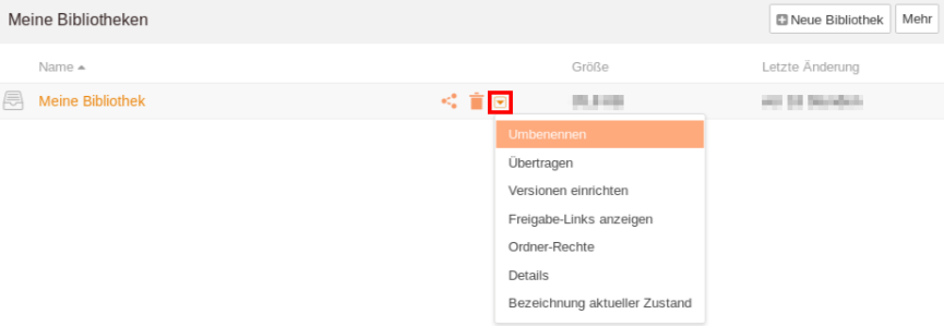 Klicken Sie links oben in der Rubrik Dateien auf Meine Bibliotheken. Fahren Sie mit der Maus auf die Bibliothek, die sie umbenennen möchten. Daraufhin erscheinen rechts vom Bibliotheksnamen drei Symbole, darunter ein nach unten gekehrtes Dreieck für Weitere Aktionen. Klicken Sie darauf und wählend sie den ersten Punkt Umbenennen aus. Jetzt können Sie der Bibliothek einen neuen Namen geben und Ihre Wahl mit dem Haken bestätigen oder die Umbenennung durch Anklicken des Kreuzes abbrechen.
