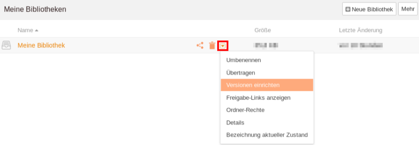 Rechts neben der Schaltfläche +Neue Bibliothek befindet sich die Schaltfläche Mehr. Unter deren Menüpunkt Gelöschte Bibliotheken finden Sie eine Liste mit gelöschten Bibliotheken, die mit einem Klick auf den Pfeil wiederhergestellt werden können. Der Pfeil erscheint allerdings nur, wenn Sie mit der Maus über den entsprechenden Bibliotheksnamen fahren.