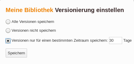 Unter Versionen einrichten wird festgelegt, ob und wie lange Versionen einer Bibliothek gespeichert werden sollen. Eine neue Version wird angelegt, wenn Änderungen an der Bibliothek vorgenommen wurden, z.B. durch Hochladen neuer Dateien und Ordner oder durch Bearbeitung der Dokumente. Die Einstellungen für die Bibliothek sollten Sie nur verändern, wenn Sie einen guten Grund dazu sehen.