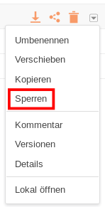 Führen Sie Ihre Maus über die Datei, die Sie sperren möchten. Mit einem Klick auf Weitere Aktionen, öffnet sich das Bearbeitungsmenü. Nun können Sie die gewünschte Datei sperren oder entsperren.