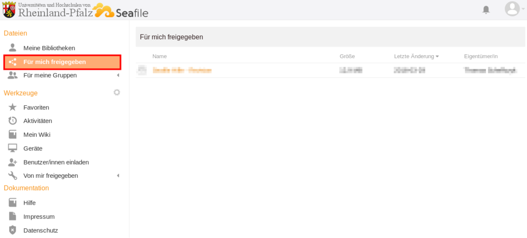 In der linken Ecke oben auf der Startseite befindet sich Für mich freigegeben. Darin finden Sie Ordner und Dateien, die von anderen Seafile-Nutzern für Sie zur Einsicht oder Bearbeitung freigegeben wurden. Entsprechend den festgelegten Rechten dürfen Sie dann die freigegebenen Dateien entweder einsehen und herunterladen oder von Ihnen bearbeitete Versionen hochladen und Dateien ersetzen. Falls an Sie keine Rechte für die Administration der Bibliothek vergeben wurden, können Sie keine Änderungen an den Einstellungen derselben vornehmen, sondern lediglich die Bibliothek verlassen bzw. Ihren Zugriff darauf löschen.