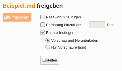 Das folgende Fenster öffnet sich. Sie können jetzt einen Download-Link zur gewünschten Datei erstellen. Falls gewünscht, können Sie ein Passwort hinzufügen oder den Link mit einem Ablaufdatum versehen.