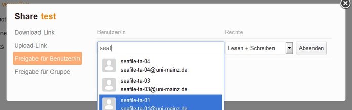 Sie können einzelne Dateien oder ganze Ordner freigeben, entweder durch das Versenden eines Links oder durch Rechtevergabe, wobei sich der Empfänger auf Seafile einloggen muss.