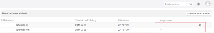 Bis zum ersten Login des Benutzers können Sie die Einladung mit einem Klick auf das Mülleimer Icon wieder löschen. Das grüne Häkchen unter Angenommen zeigt an, ob der Benutzer die Einladung angenommen und sich eingeloggt hat. Außerdem sehen Sie, wann Sie die Einladung versendet haben und zu welchem Zeitpunkt die Einladung abläuft.